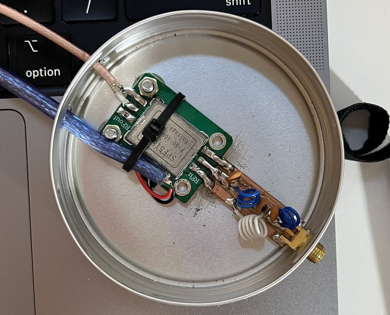 Next steps: replace the Flower Pot with something vertical and omnidirectional with higher gain, and modify the SPF5189Z to feed it through a bias-tee.