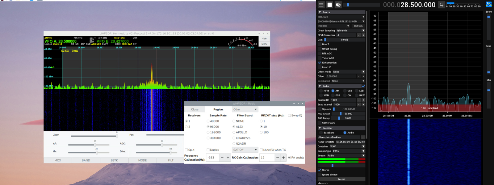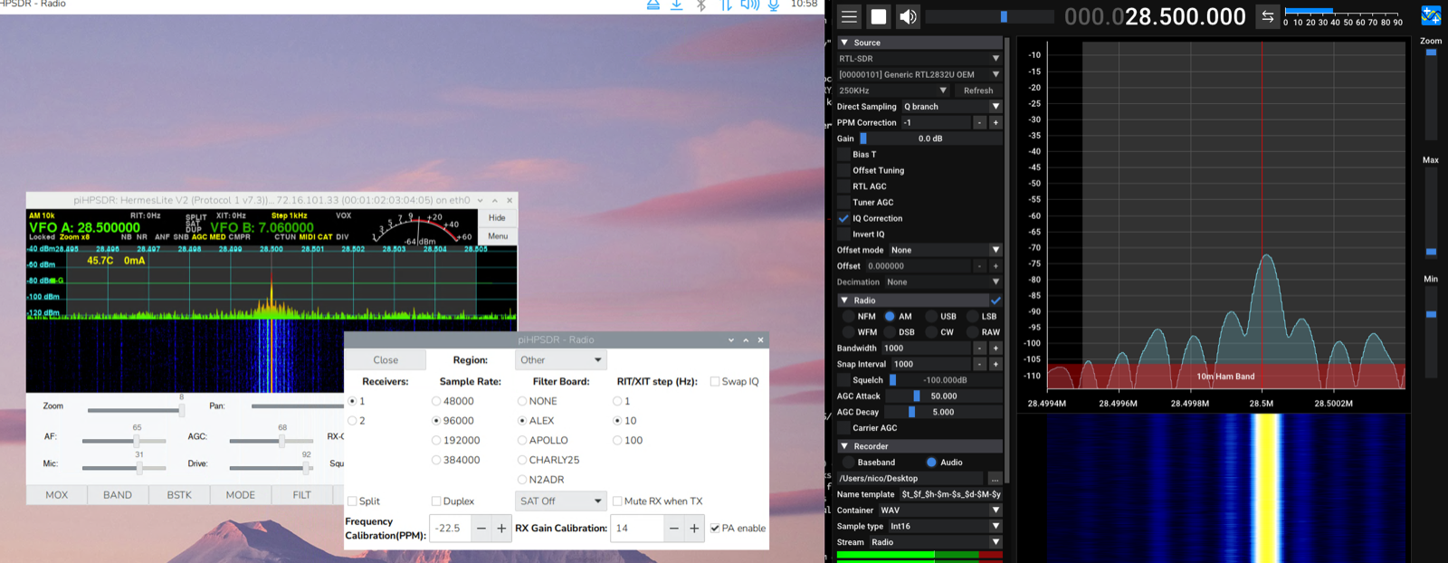 To have a reliable reference signal, I used a second FT-80C (an original, unmodified one that I know is properly calibrated) transmitting into the dummy load at 7.060 MHz and 28.5 MHz. On the receiving side, I also verified the readings with an RTL-SDR v3 dongle that I had previously confirmed was frequency-accurate. So the calibration process involved three devices: the original FT-80C as a TX reference, the RTL-SDR as an independent RX reference, and the RadioBerry itself in both RX and TX modes. Not laboratory-grade equipment by any means, but reasonable enough for a home setup.
