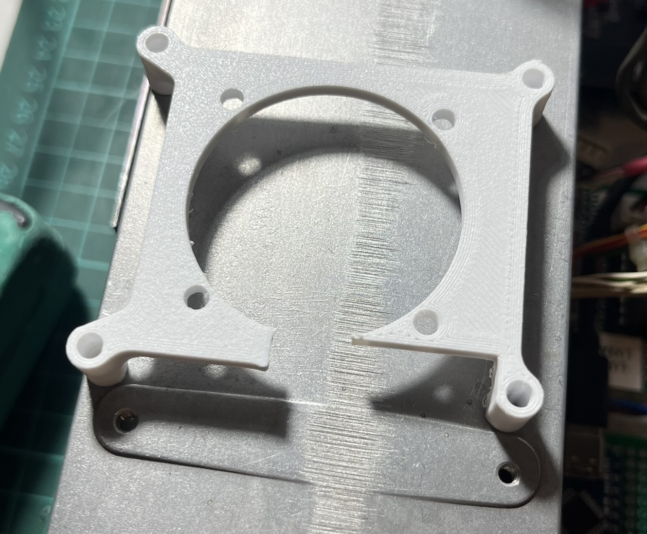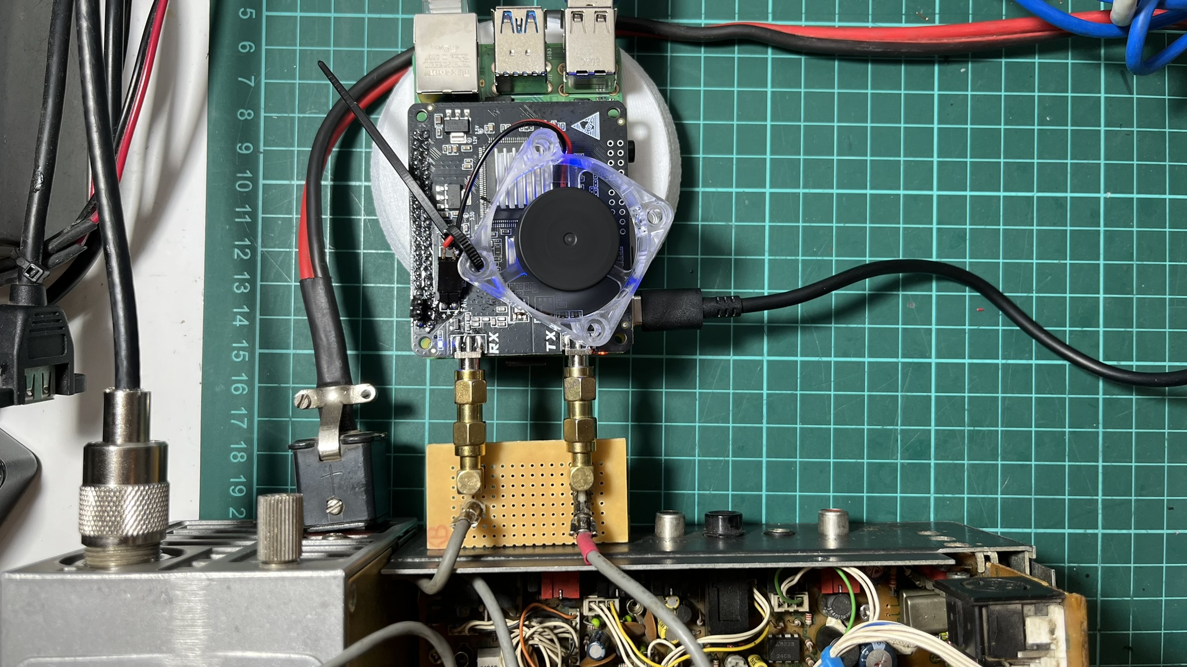 The RadioBerry needs good airflow to keep the FPGA cool during TX. I printed a small bracket to hold a 40mm fan, with a cutout for the SMA connector that goes to the PA board.