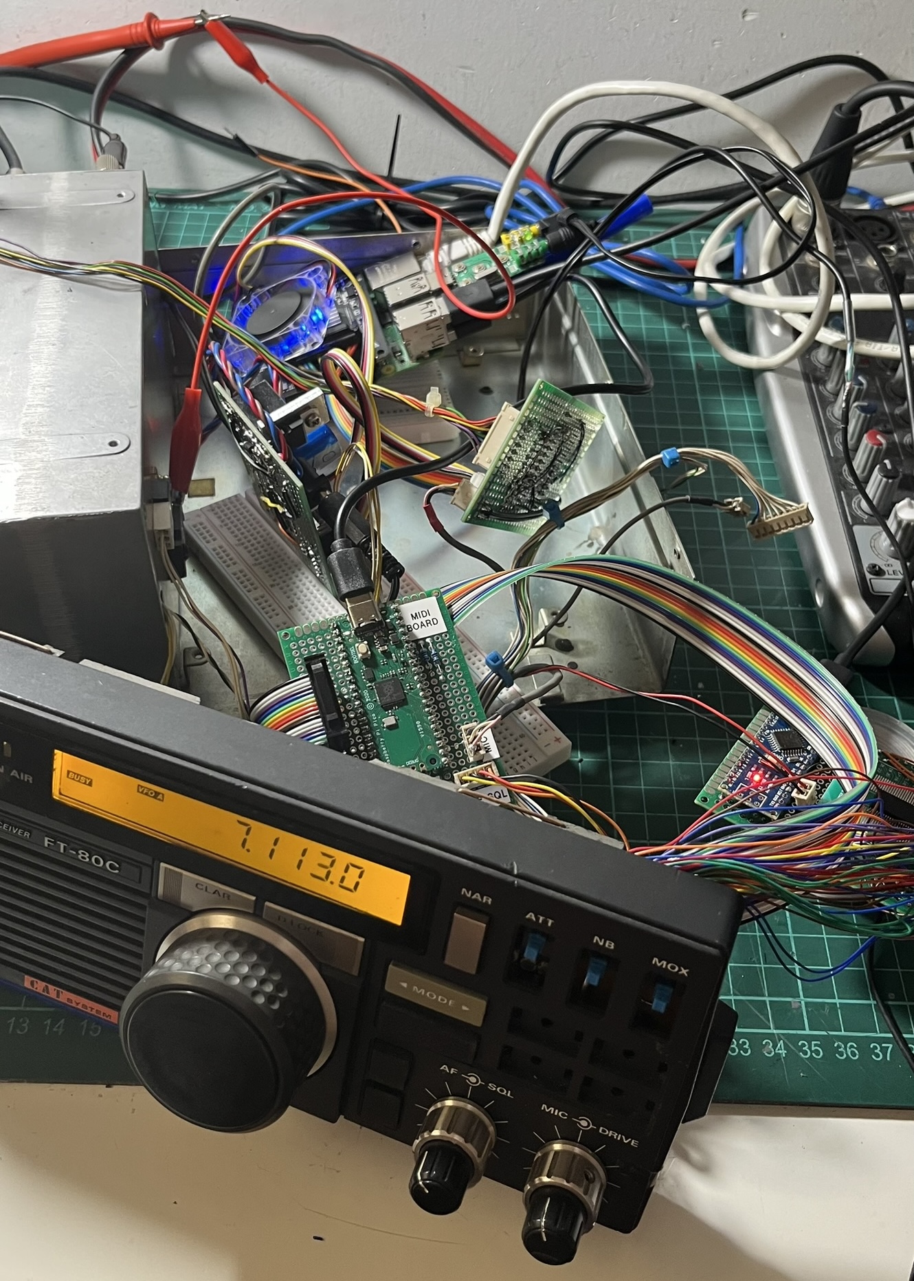 The FT-80C (also sold as FT-747GX) is a classic late-80s HF transceiver. Unlike the VX1700, where I built a completely new front panel with a touchscreen, this time I wanted to preserve the original look. The challenge was clear: make the RadioBerry control everything while keeping the radio looking exactly like it did 35 years ago, ensuring aesthetic integrity while adding modern functionality.