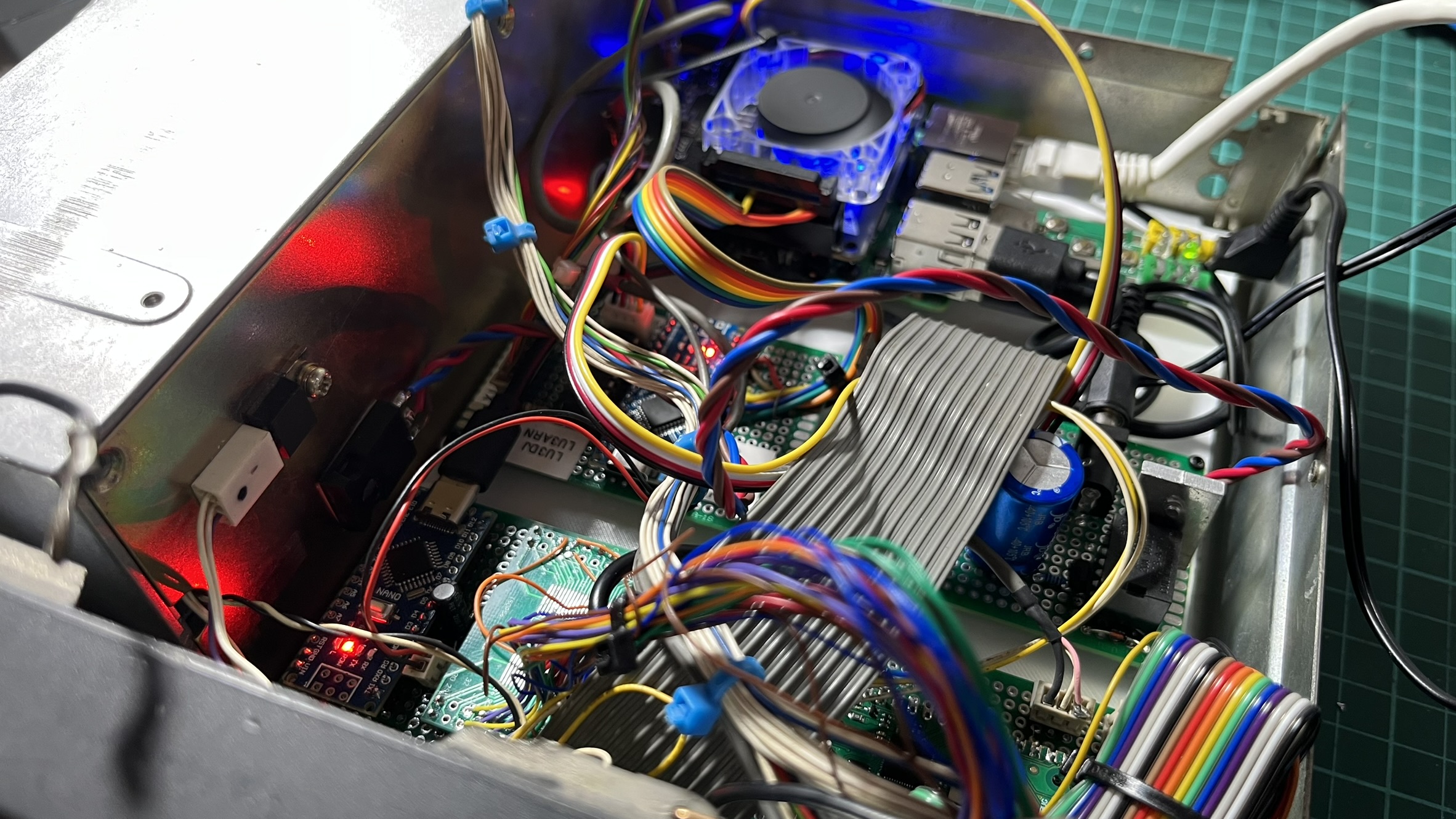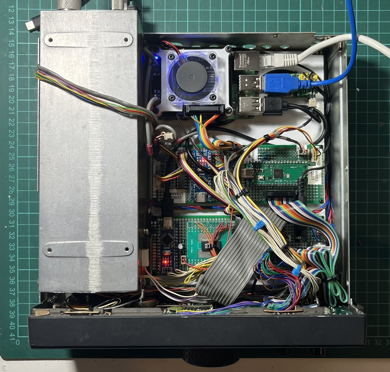 The RadioBerry’s blue LED glows through the top vent, and you can see status LEDs from the Arduino boards if you look closely. The original cooling fan still works, keeping everything at reasonable temperatures.