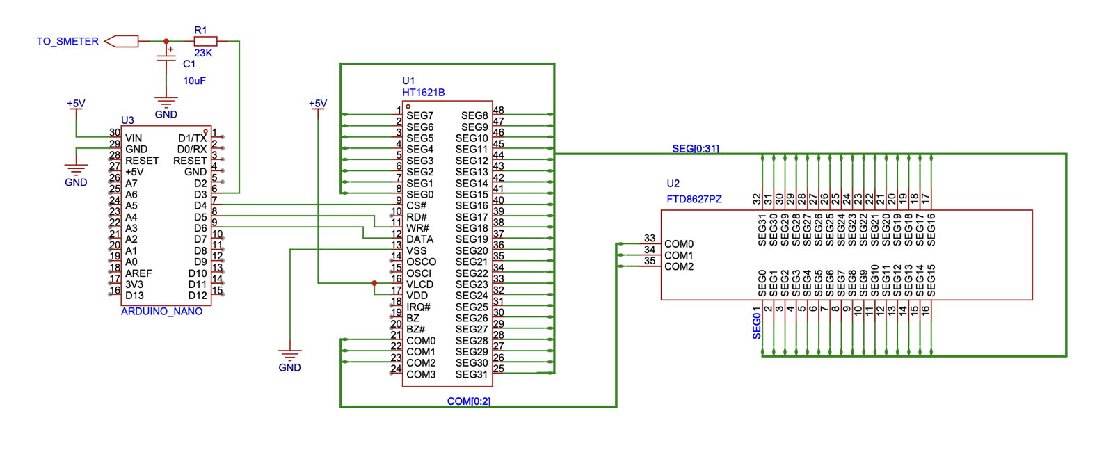 The Arduino running the HT1621B code receives commands via serial from a Python bridge script on the Raspberry Pi. The bridge polls piHPSDR’s rigctl interface (port 19090) for frequency, mode, and S-meter readings, then forwards them to the Arduino using Kenwood CAT protocol.