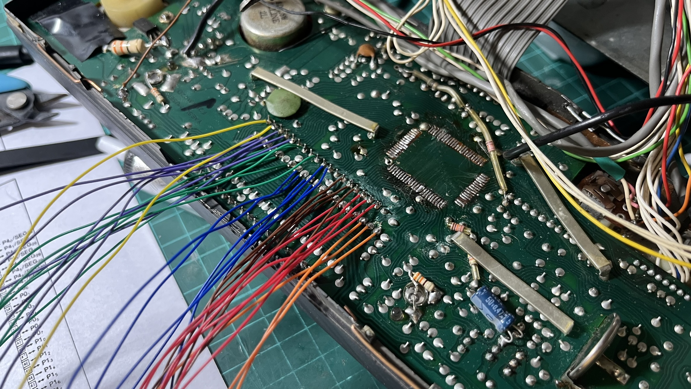 The LCD has 32 segment lines plus 3 COM lines. I had to physically disconnect the M50932 from the display (isolating its outputs to prevent interference) and run 35 wires to the HT1621B.