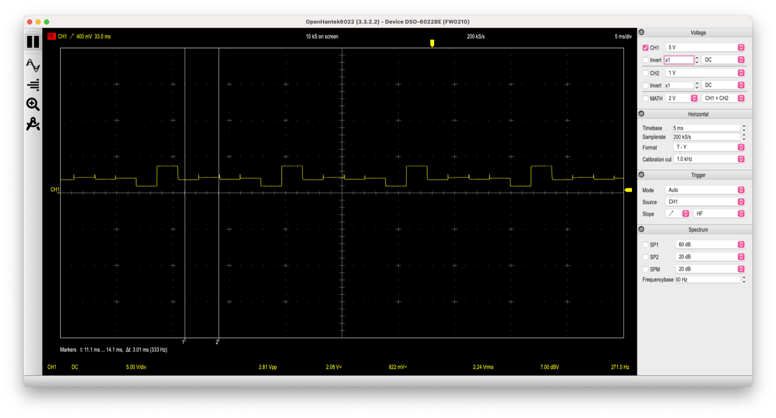 The first test was simple: configure the HT1621B with the same parameters as the original controller and see if I got similar waveforms. I did.